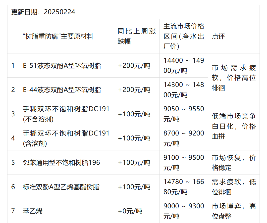 【NACA MatPrice每周价格更新】20250224树脂重防腐 主要原材料价格及变化